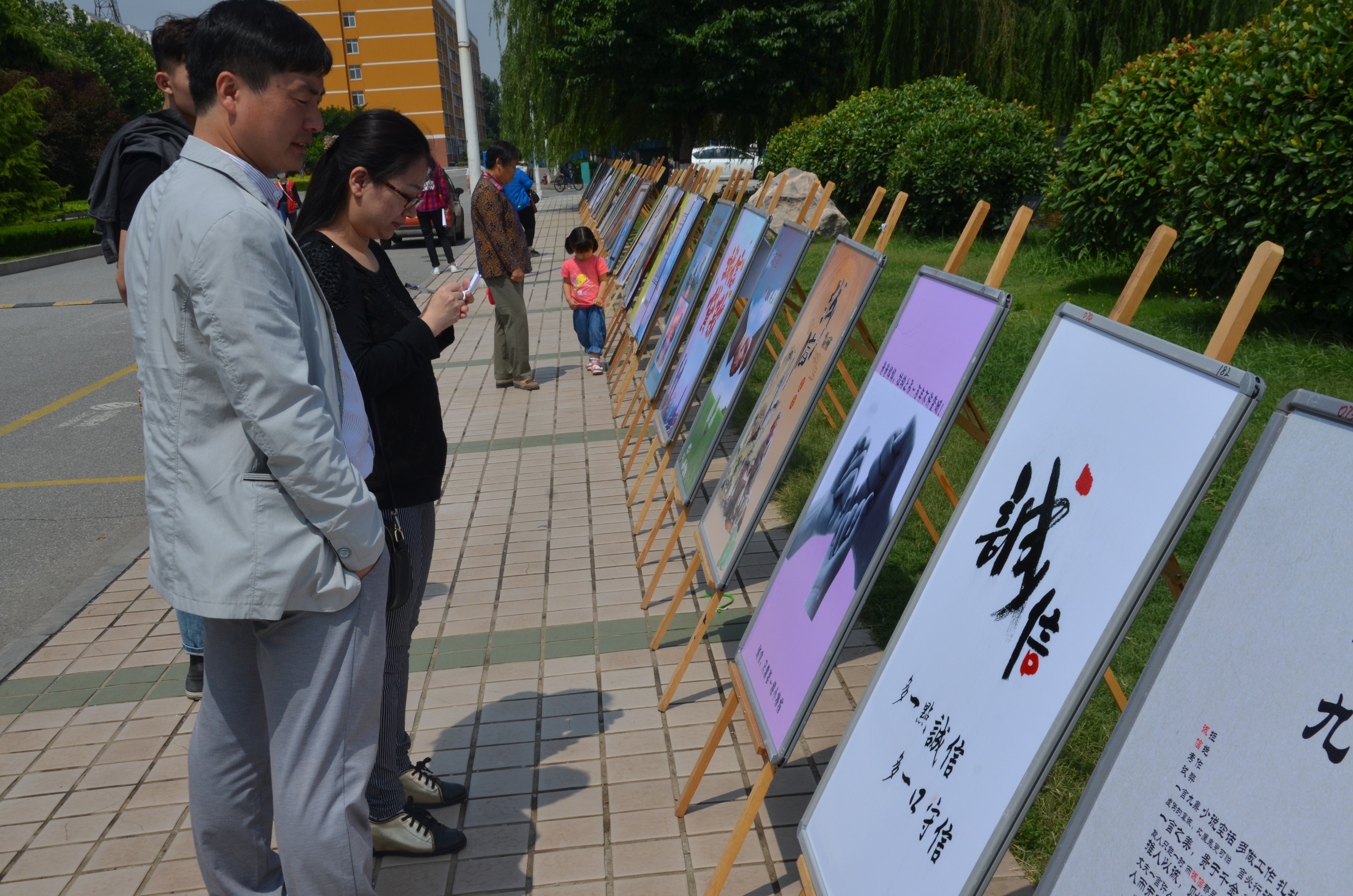 6月6日,由校学生资助管理中心主办,艺术设计学院承办的“诚信校园行”安阳工学院公益海报设计大赛入围作品展览在至善湖畔举办。校学生工作处副处长邓辉,资助管理中心主任郭海东,艺术设计学院党总支书记牛晓雷、党总支副书记赵红杰、校党委宣传部文明办主任张林等一行数人前来参观指导。
