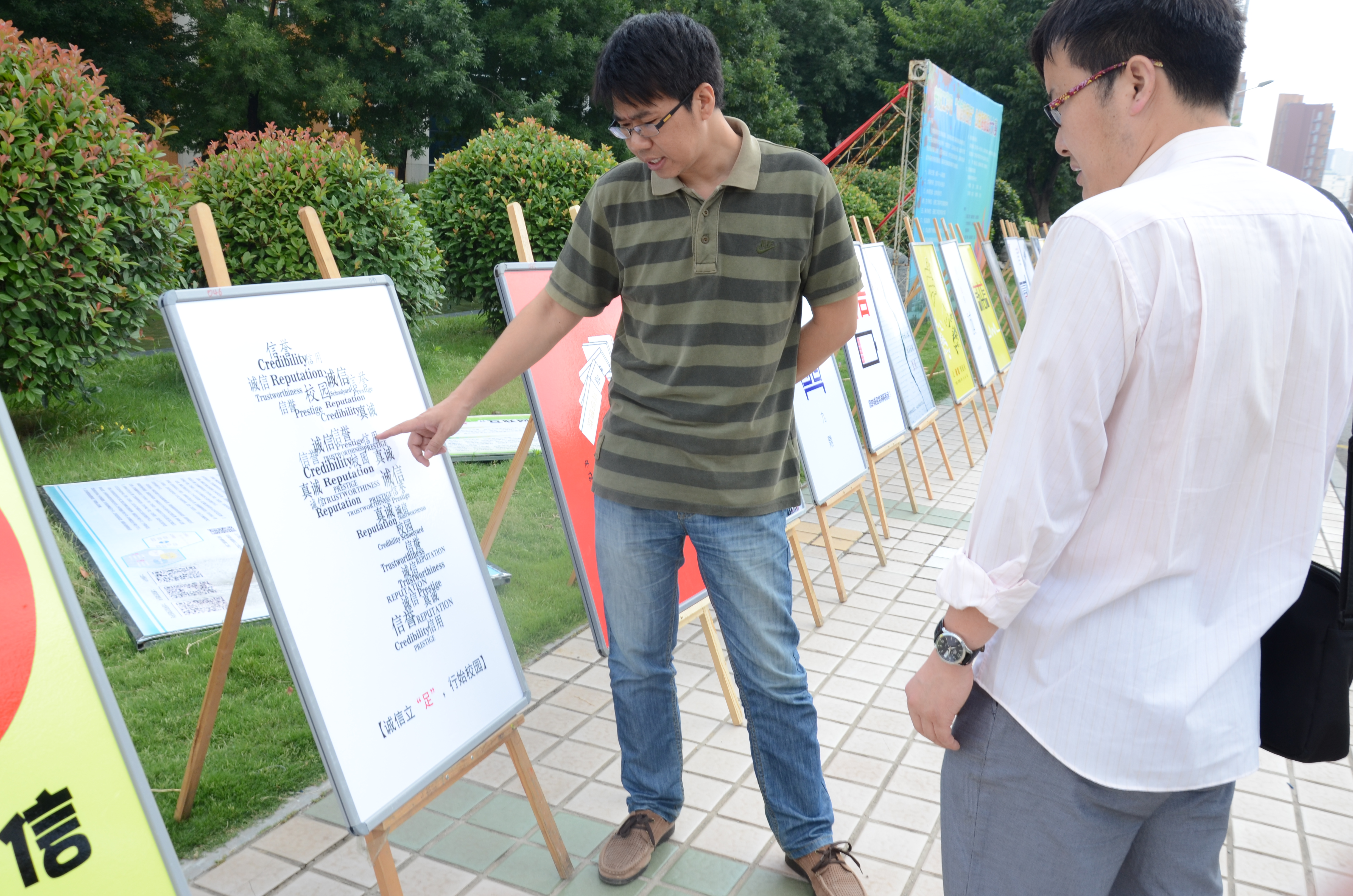 大赛以“诚信”为主题,共收到7各学院的266幅作品,6月5日在艺术设计学院大厅进行了初选,现在展出的为120入选作品,此次展览为引导学生进一步了解诚信,认知诚信,遵守诚信。在展览会上,学生工作处副处长邓辉评价,此次大赛很大程度上让广大学生了解并认知了诚信的重要性,促进了校园的诚信文化建设,同时也让广大同同学都参与到了活动中来。他还建议,在新生开学时,能展出这些作品,让新生对诚信能有全新的认识。