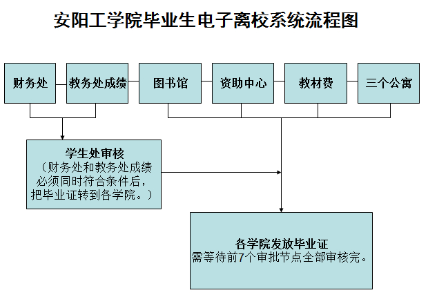 电子离校手续在线审批涉及8个节点,分别有:1.财务处,2.教务处,3.亚洲欧美精品,4.教材科,5.图书馆,6.资助中心,7.学生公寓,8.各学院。