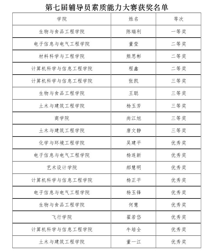 经过激烈角逐,生物与食品工程学院陈瑞利获得一等奖;电子信息与电气工程学院董莹等三位辅导员获得二等奖;计算机科学与信息工程学院张凯等五位辅导员获得三等奖;化学与环境工程学院吴建平等九位辅导员获得优秀奖。