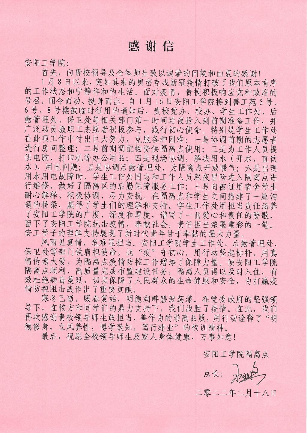 隔离点为我校学生工作处赠送感谢信