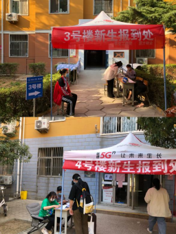 在各公寓区,小萌新们佩戴口罩、扫码登记,在门卫大叔、宿管阿姨和志愿者们的帮助下,有序进入宿舍区,办理入住。