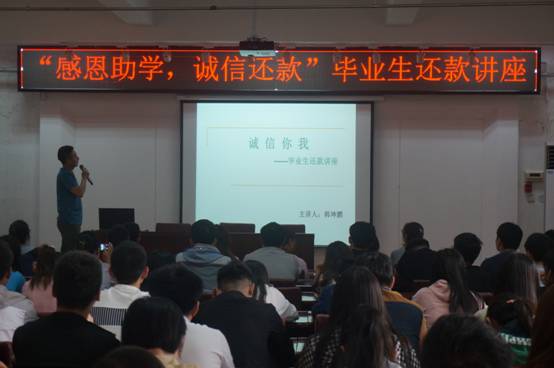 在所有同学有序进场入座后,主持人宣布会议正式开始,首先,由学贷部韩坤鹏为大家讲解助学贷款相关内容,尤其在还款流程以及不还款的后果这两方面进行了着重讲解,使同学们熟悉并掌握还款方式、还款流程的要点以及还款的注意事项,认识到诚信还贷的重要性。随后,由学生代表李志恒发言,联系生活实际,向同学们表明了诚信还贷的重要性。最后,由亚洲欧美精品资助管理中心马伟伟老师对本次专题讲座作出总结,再次向同学们阐明了诚信还贷的重要性。