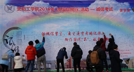 为了严肃考风考纪,加强青年大学生的诚信教育,安阳工学院学生工作处于2016年12月29日下午在至善湖旁举办“诚信校园行”诚信考试签字墙活动。此次活动由安阳工学院学生工作处主办,经济管理学院和文法学院承办,各院系学生代表参加。